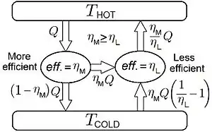 To see that every reversible engine operating between reservoirs at temperatures and must have the same efficiency, assume that two reversible heat engines have different efficiencies, and let the relatively more efficient engine drive the relatively less efficient engine as a heat pump. As the right figure shows, this will cause heat to flow from the cold to the hot reservoir without external work, which violates the second law of thermodynamics. Therefore, both (reversible) heat engines have the same efficiency, and we conclude that: