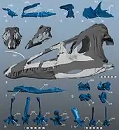 The size of the holotype specimen is difficult to assess, as the two most characteristic elements of the skeleton, the skull and the humerus, are proportionally unusual. Estimating body size from the skull predicts a much larger humerus, and estimating it from the humerus predicts a much smaller skull. This may indicate that the skull was unusually large, the forelimbs were unusually small, or both. Roughly scaling from local crocodylomorph taxa such as Dromicosuchus and an undescribed species (specimen NCSM 21722), Zanno et al. (2015) provided an estimated length of 3 m (9.8 ft). However, it likely grew larger, as the holotype specimen was immature owing to the unossified neurocentral canals.[1] Along with Redondavenator and CM 73372 (another undescribed species), Carnufex was among the largest Triassic crocodylomorphs. These three were among the earliest crocodylomorphs, casting doubt on the hypothesis that characteristic crocodylomorph features evolved after a reduction in body size, rather than before.[2] Carnufex possesses a myriad of features characteristic of both crocodylomorphs and their more distant ancestors, reptiles like Postosuchus. However, it is also highly autapomorphic, meaning that it possessed many other features which are completely unique to it, distinguishing it from its close relatives.[4] The skull was large, elongated, and heavily textured in some areas, while the forelimbs were small.[1][4]