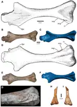 The humerus was short, with a constricted shaft. It was more similar to Postosuchus than it was to other crocodylomorphs, as a result of several features. These include a distal end approximately three times as wide as the shaft (as opposed to two times as wide), and the presence of an ectepicondylar groove and supinator process (which are not present in other crocodylomorphs). There is also a unique characteristic present in Carnufex but absent in all of its relatives, that being a pronounced crest forming the rear edge of the ectepicondylar groove.[2]