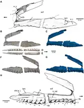 The dorsal neural arch is similar to that of the cervical, with a few differences. The diapophyses are much shorter and the zygapophyses are more level. The dorsal is also less complex than the cervical, with only a few laminae and fossae. These include a less prominent "hyposphene", possibly an intermediate stage between reptiles like Postosuchus, which has a prominent hyposphene in its dorsals, and crocodylomorphs, which lack such a structure entirely. The neural spine is slightly expanded anteroposteriorly at its tip, like non-crocodylomorphs, but it does not have a spine table (lateral expansion). An asymmetrical extension visible from the underside of the neural arch may be a pathological feature. Preserved ribs are similar to those of other paracrocodylomorphs.[2]