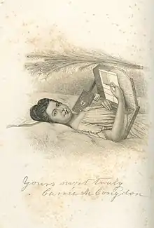 Congdon was a native of Onondaga County, New York, and lived[1] for most of her life in the town of Amber.[2] One of five siblings, early in her childhood her father died, and the family was left with little money. Caroline was educated at home and in the local district school, and early displayed a taste for intellectual pursuits, but she suffered from chronic poor health, including a fever and paralysis which left her bedridden at the age of fourteen. Left only with the use of her hand, she began to write poetry, using a pencil and a specially-made upside-down table which held the paper in place over her head and chest. In this manner she produced enough poems to fill a volume, The Guardian Angel, which was published in 1856 and which featured as a frontispiece a portrait of Congdon in her bed.[1] The poems range from shorter works on a variety of topics to long, narrative pieces on romantic subjects; the book also contains a poem on an abolitionist subject.[2][3] In the preface she asked "the Critic to spare my little book, and the tender-hearted Reader to drop a tear of sympathy for its afflicted Authoress"; she died four years after the book's publication.[1] She is buried in the village cemetery in Amber.