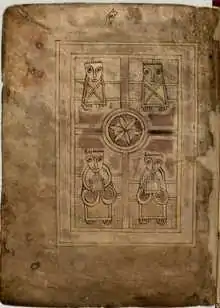 The design of the Carolingian cross borrows heavily from the compositional style of insular art contained within the interlacing or knot work of the Anglo-Saxon Lindisfarne Gospels ‘carpet pages’.[22] Sacred number theory was one of the most important features of Christian art throughout the Middle Ages, and one of the prime arguments against images and sculptures of the cross being seen as blasphemous idolatry.[23] Augustine of Hippo created one of the first defences of Christian imagery by asserting that the universe operated according to ordered design, that numerical geometric representations constituted the core of divine providence.[24] This was later backed up by Irish monks in their writings contained within the 628a.d. ‘Liber de ordine creaturarum’ (the book of the order of creation), and the dialogues contained within it, the computus (calculation).[25] The Irish monks used the logic of Boethius’ ideas on universal geometry noting that: “everything that is fashioned from the first nature of things (a prima rerum natura), is perceived to be given form by the ratio of numbers”, for this was the principal exemplar in the creator's mind.[26] From this is derived the multiplicity of the four elements, the changes of the seasons, and the understanding of the cycle of the motion of the stars and the heavens.[26] This idea of the four elements ties in well with the Carolingian cross imagery: the four elements = the four cross points; which in turn comes to symbolically represent the four ideas of divine providence; the father (God), the son (Christ), the holy spirit, and the divine order or unity of the cosmos, as is seen in the Essen Gospels.[26] Gospel manuscripts were a vital component to the Christianisation of Frankish medieval Europe, as most non-Christian societies of the time had sparse written records of their religious beliefs and were generally illiterate in Latin.[27] The visual imagery and spoken poetry of gospels aided in the spread of the cross being understood by all lay people and non-Christians alike as the ultimate representation of Christ.[28]