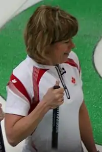 McRorie is known for her distinctive "Manitoba tuck" delivery while using a corn broom while delivering the rock.