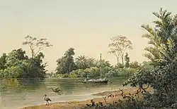 The Caroni River originates as the Aripo River in the Northern Range and drains west into the mangrove wetlands of the Caroni Swamp.[2]