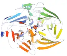 - Apocarotenoid-15,15'-oxygenase from bacteria and cyanobacteria, which converts beta-apocarotenals rather than beta-carotene into retinal. This protein has a seven-bladed beta-propeller structure.[6]