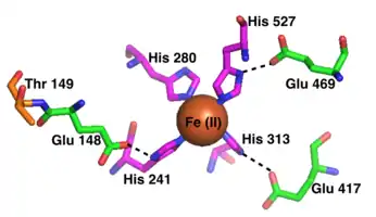 Members of the family use an iron(II) active center, usually held by four histidines.