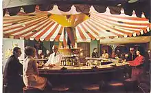 The Carousel Piano Bar & Lounge is the only revolving bar in New Orleans, Louisiana. The bar is inside the Hotel Monteleone and overlooks Royal Street in the French Quarter of New Orleans. Installed in 1949, the 25-seat circular bar turns on 2,000 large steel rollers, powered by a 1⁄4 hp (190 W) motor. The bar rotates at a rate of one revolution every 15 minutes. In addition to the rotating bar, an adjoining room includes booths and tables with live entertainment offered nightly.[1]