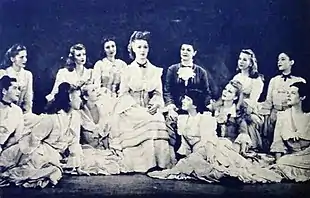 The original Broadway production opened at the Majestic Theatre on April 19, 1945. The dress rehearsal the day before had gone badly, and the pair feared the new work would not be well received.[52] One successful last-minute change was to have de Mille choreograph the pantomime. The movement of the carnival crowd in the pantomime had been entrusted to Mamoulian, and his version was not working.[44] Rodgers had injured his back the previous week, and he watched the opening from a stretcher propped in a box behind the curtain. Sedated with morphine, he could see only part of the stage. As he could not hear the audience's applause and laughter, he assumed the show was a failure. It was not until friends congratulated him later that evening that he realized that the curtain had been met by wild applause.[52] Bambi Linn, who played Louise, was so enthusiastically received by the audience during her ballet that she was forced to break character, when she next appeared, and bow. Rodgers' daughter Mary caught sight of her friend, Stephen Sondheim, both teenagers then, across several rows; both had eyes wet with tears.[45]