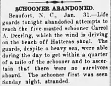 ![]() Schooner Carroll A. Deering, as seen from the Cape Lookout lightship on January 28, 1921. | |