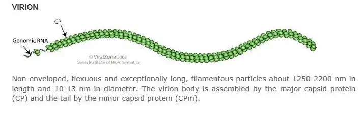 The +ssRNA genome is 15.5 to 19.3 kb, contains a 3’ terminus, and does not have a poly(A) tract. The 5’ terminus commonly has a methylated nucleotide cap. The virus genome is 1250-2200 nm in length and 10-13 nm in diameter.[2]