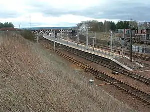 The route through the station was electrified in the 1974 electrification scheme that covered the West Coast Main Line between Weaver Junction and Glasgow Central. As part of this the station was re-signalled. The critical point was the connection from Edinburgh on a minimum radius curve to provide a connection into the Down platform whilst avoiding the installation of a diamond crossing. The provision of superelevation through the Up platform for 90 mph running required deep ballasting; this required the platform to be raised. The original station buildings were being retained, and continuous railings were provided to prevent passengers accidentally falling down from one level to the other.[11] This height difference has now been removed as the original station buildings were demolished and replaced with a more modern alternative and the entire platform was levelled off. The only remnant of the original station buildings was the integral footbridge, now adapted as a stand-alone structure.