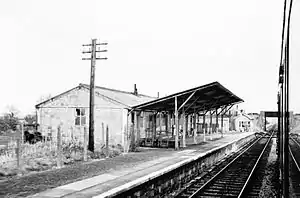 Construction of the station had begun in May 1944 when a siding was laid on the Down side which, three months later, was adapted as a passing loop opened on 10 August, 18 chains (360 m) in length and fully signalled for passenger services.[8][9] The station had platforms on the Up and Down lines; an austere War Department-type structure resembling an RAF hut, stood on the Up side.[10] The front of the building was sheltered by a makeshift asbestos canopy and a traditional timber signal box stood just beyond the end of the Up platform.[11] A very basic corrugated iron shelter was provided on the Down platform.[12] No goods facilities were provided as Brize Norton and Bampton station lay within close proximity 1 mile 32 chains (2.3 km) to the east,[10][13] although agricultural produce from smallholdings in Carterton were often dispatched by passenger train.[14][15]