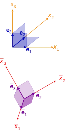 In another rectangular coordinate system, x as a contravector has coordinates xi and basis ei, while as a covector it has coordinates xi and basis ei, and we have: