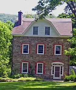 The land was originally the property of Isaac Bobbin, an early settler, until being subdivided into the present parcel and sold to Mathias Carvey in 1805, around the time the stone house was built. The house was built in the first decade of the 19th century in the then-dominant Federal style, with two storeys, three bays and a sidehall plan. However, it also features some unique touches such as a gambrel roof, with a corresponding dormer added later. It also appears taller than it actually is due to the sloping land beneath. An original front porch that ran the width of the house was removed during the 20th century.[1]