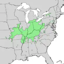 Shellbark hickory is widely distributed, but is nowhere common. The range extends from western New York through southern Michigan to southeast Iowa, south through eastern Kansas into northern Oklahoma, and eastward through Tennessee into Pennsylvania. This species is most prominent in the lower Ohio River region and south along the Mississippi River to central Arkansas. It is frequently found in the great river swamps of central Missouri and the Wabash River region in Indiana and Ohio. It's also found scattered in the Hudson valley in New York state