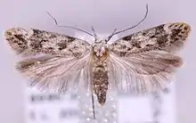 The length of the forewings is 5.5–6.5 mm for males and 6–7 mm for females. The forewings are whitish, mottled with light brown and orange-brown.[3] Adults have been recorded on wing from early July to early September.