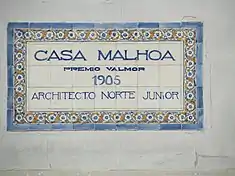 On the first floor of the central block are four rectangular windows, while the second floor includes one large window on corbels with iron grating. Above the curved window, with three accented voussoirs crowned by a rectangular block and tabulature.[1][2] Below the window is a platform on six corbels with ironwork. The lateral left wing, which is recessed from the main facade, includes a staircase access to the principal rectangular door.[1][2] On the second floor of this wing are small windows with stone bows. Corbels support the cornices and protruding eaves.[1][2] The lateral right wing, which is light protruding, includes a rounded corner window with accented voussoir, supporting the a corbel for the upper window. This second floor includes a curved arched with inset curvilinear window flanked by two columns. This wing is crowned by gable roof with robust frame and accented voussoir.[1][2] A frieze of azulejo mark the division between the first and second floors on various registers of the facades, consisting of blue and white figures and floral patterns.[1][2] In the rear some in yellow. The central body is crowned by azulejo frieze with yellow and white PROARTE plaque.[1] On the lateral right facade is a 45 azulejo tiles with the following inscription lined with artistic border: CASA MALHOA / PREMIO VALMOR / 1905 / ARCHITECTO NORTE JUNIOR.[1] This is the unique azulejo plaque or reference that highlights the Prémio Valmor award.[1] Sculptures on the facade are by António Augusto Costa Mota, while all the ironworks were forged by Norte Júnior and executed by the carpenter Vicente Joaquim Esteves, with several masonic elements.[2][4]