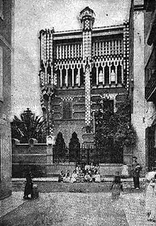 In 1878 Gaudí received a commission from Manuel Vicens i Montaner to build a summer residence for the family in the town of Gràcia.[7] Manuel Vicens (1836-1895) was an stock and currency broker,[8] although there is little information about him. From his will, it is known that he had a house in Alella, as well as two properties in the centre of Barcelona and some land in the Vallvidrera area.[9] The land where the house was built had been inherited by Manuel Vicens from his mother, Rosa Montaner i Matas, in 1877.[10] He died on April 29, 1895, leaving his properties to his widow, Dolors Giralt i Grífol.[note 1]