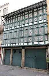 It has a simple longitudinal, rectangular plan with a vertical volume extending to three floors, with a differentiate covering in tile.[1] The principal facade (oriented to the northwest) includes three entrances, covered in wood doors.[1][2] The facade of the second and third floors are totally covered in wood-lattice painted in white, while the box frames are painted green.[1][2] This type of covering/window was utilized during the 17th century by many families in Braga, a town considered conservative, as a means of safeguarding privacy in a religiously conservative town.[2][3]