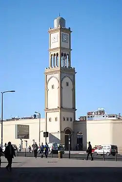 The Casablanca Clock Tower (Arabic: برج الساعة بالدار البيضاء, French: Tour de l'horloge de Casablanca) is a clock tower in Casablanca, Morocco. Located in United Nations Square, the tower is a 1993 reproduction of one of the oldest French-built structures in the city. The original tower was built between 1908-1910 by the French commander Charles Martial Joseph Dessigny, as an identical copy of one he had built in Aïn Séfra when stationed there previously.[1][2][3][4]