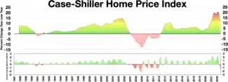 The Standard & Poor's CoreLogic Case–Shiller Home Price Indices are repeat-sales house price indices for the United States. There are multiple Case–Shiller home price indices: A national home price index, a 20-city composite index, a 10-city composite index, and twenty individual metro area indices. These indices were first produced commercially by Case Shiller Weiss. They are now calculated and kept monthly by Standard & Poor's, with data calculated for January 1987 to present. The indices kept by Standard & Poor are normalized to a value of 100 in January 2000. They are based on original work by economists Karl Case and Robert Shiller, whose team calculated the home price index back to 1990. Case and Shiller's index is normalized to a value of 100 in 1990. The Case-Shiller index on Shiller's website is updated quarterly.[1] The two datasets can greatly differ due to different reference points and calculations. For example, in the 4th quarter of 2013, the Standard and Poor 20 city index point was in the 160's, while the index point for 4th quarter on the Shiller data was in the 130's. Shiller claims in his book Irrational Exuberance that such a long series of home prices does not appear to have been published for any country.[2]