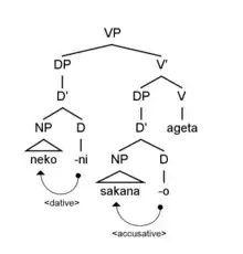 In much of the transformational grammar literature, morphological cases are viewed as determined by the syntactic configuration.[10] In particular, the accusative case is assigned through a structural relation between the verbal head and its complement.[10] For example, the direct complement of a verb is assigned accusative, irrespective of any other properties that it might have.[10] It must be acknowledged that it is not the accusative alone that is structural, rather the specifier of a NP is in the genitive in many languages, and so is the direct object of a nominalized verb.[10]