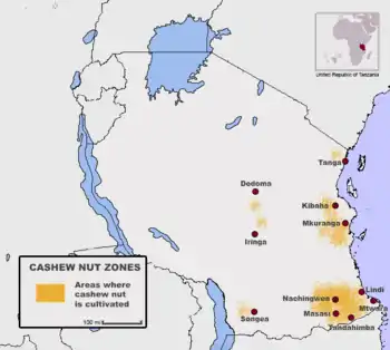 The cash crop is usually cultivated in the southern coastal regions of the country, near the towns of Mtwara, Kilwa and Dar es Salaam. The sale and marketing of the product is run by the Cashewnut Board of Tanzania, through various farmer co-operatives.[4] More than ninety percent of the exports are destined for India and almost entirely in raw form. The lack of domestic processing firms costs the country vital foreign revenues and thousands of jobs. The Tanzanian government has been facing challenges for finding potential investors in order to revive the cashew processing industry in Tanzania.[5]