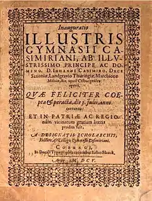The Casimirianum is a Renaissance building designed and built by Peter Sengelaub. On 2 September 1601, the foundation stone was laid by Duke Johann Casimir and he returned on 3 July 1605 the inauguration. According to the foundation charter, the Duke intended this state school to be ein medium oder Mittel[1] (German, "a medium or middle") between a Trivialschule (an elementary school) and a high school or academy. The lectures were to be public et gratis (Latin, "free to the public"). A Convictorium (Latin, "boarding school") was established "with two tables, of twenty-four boys, one table free, and the other, for a weekly fee of 7 groschen by any person"[2] The Duke understood "how sometimes . . . poor people's children, who are naturally good and capable of intelligence, and the same to seek and learn, are also eager to be educated, are often overlooked, ignored and neglected; that we would not like to hear or be heard in the least..."[2]