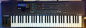 The HT-3000 was the full-size version of the HT-700. Like the HZ-600 (but in distinction from the MT-600 and HT-700), it had 61 full-size keys, a modulation wheel, volume-pedal jack, MIDI THRU, and a 3-point splittable keyboard. Versus the HT-700, it also added a few other features such as an "Ending" for auto-rhythms, and "auto-harmonize." The HT-3000 was also sold by Hohner in Germany as the 'KS-61 Midi'.