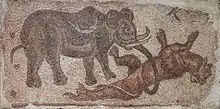 In the Fables of Pilpay, the tiger is described as furious and avid to rule over wilderness.[43] The babr (Persian: ببر, tiger) features in Persian and Central Asian culture. The name "Babr Mazandaran" is sometimes given to a prominent wrestler.[8] A Syrian mosaic in Palmyra depicts the Sassanids as tigers, possibly commemorating the victory of the Palmyrene King Odaenathus over Shapur I. The inscription on the mosaic conceals an earlier one that read: (Mrn), which is a title used by Odaenathus.[44] It possibly celebrates Odaenathus' victory over the Persians, the archer representing Odaenathus and the tigers the Persians; Odaenathus is about to be crowned with victory by the eagle flying above him.[45]