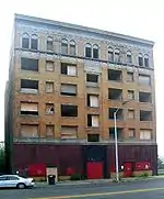 The Naomi Apartments is an Italian Renaissance apartment building, constructed in 1924 and designed by Pollmar and Ropes. It is a six-story brick structure measuring 60 feet by 166 feet. The facade is symmetrical, with a stone-covered first floor and stringcourse above, separating it from the upper floors. The windows are regularly arranged, with a flat arch overtop. The sixth floor has ornate arched window openings, with a cornice frieze below the floor and another decorative cornice above.[2] The building has undergone $17 million renovation and restoration beginning in 2014 and has reopened in 2017.