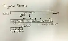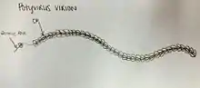 As with all of the members of the Potyviridae family, the Cassava brown streak virus has a positive, single strand RNA genome.[4] Structurally, viruses in this family are linear, non-segmented, possess helical symmetry.[6] The CBSV genome was measured to be between 8,900 and 10,818 nucleotides in length.[4] This is characteristic of the average genome length among potyviridae which can be anywhere from 9.3-10.8 kb.[6] Genetic diversity on the nucleotide level among CBSV virus isolates can be anywhere from 79.3-95.5%, showing that the virus has greater genetic diversity than other similar potyviridae or CBSV strains.[4] The Potyvirus genome is monopartite, meaning the genome is made up of a single molecule of nucleic acid, not broken up into multiple pieces.[6]
