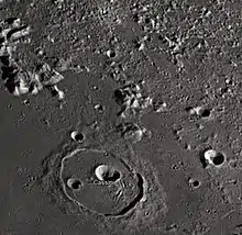 Cassini is a lunar impact crater that is located in the Palus Nebularum, at the eastern end of Mare Imbrium. The crater was named after astronomers Giovanni Cassini and Jacques Cassini.[1] To the northeast is the Promontorium Agassiz, the southern tip of the Montes Alpes mountain range. South by south-east of Cassini is the crater Theaetetus. To the northwest is the lone peak Mons Piton.
