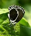 Hindwing: three basal black somewhat coalescent spots overlaid with metallic blue scaling; the costal margin above the subcostal vein and vein 7 black; this colour filling also the base of interspace 6, where in some specimens it is divided into a basal portion with a spot beyond; a postdiscal curved transverse black band followed by a subterminal transverse series of black spots, each spot edged inwardly and outwardly by very slender lunules of the white ground colour; on the inner side of the postdiscal band posteriorly is a broken line of four black generally coalescent spots two and two, the two upper often touching the postdiscal band.[5]