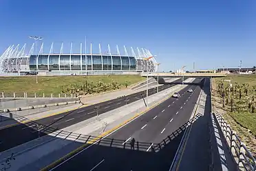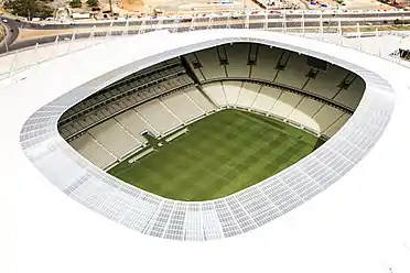 Castelão was one of the venues of the 2014 FIFA World Cup, which took place in Brazil. The stadium was redeveloped for the tournament; the reconstruction project, led by Uruguayan architect Héctor Vigliecca, involved the addition of a larger roof, the construction of an underground car park with 4,200 spaces, and a new lower tier. After the redevelopment, the stadium now has an all-seater capacity of 63,903.[4] The stadium closed on March 31, 2011 for the reconstruction project, which was officially completed in December 2012.[5] Castelão was the first of 12 stadiums being built or redeveloped for the 2014 World Cup to be completed.[5]
