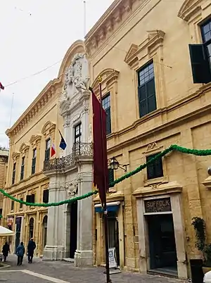In 1894, the Malta Society of Arts, Manufactures and Commerce (established in 1852) housed a temporary exhibition at the Castellania.[288] The building was considered ideal to showcase the works of the society by local artisans.[288] However, Gerald Strickland handed the artisans society another building in St John Street[289] opposite St John's Co-Cathedral, the Palazzo Xara (destroyed in WWII)[290] so that the Castellania can be vacated for a more permanent use.[288]