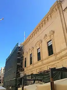 Since the British period some of the prison cells were modified and converted into government offices, and currently still serve this purpose.[315] Other parts of the Castellania's interior, including the chapel and one of the prison cells, were restored in the 1990s.[109] The restored cell appears on the front cover of the book Kissing the Gallows: A Cultural History of Crime, Torture and Punishment in Malta, 1600–1798, authored by William Zammit.[85][316] There were further plans to restore the façade in the late 1990s, but nothing materialized.[317][318] The façade was again restored as part of a number of projects for Valletta 2018 – European Capital of Culture.[319][320][321][322] A detailed study for the restoration of the façade took place, which gave the way to call for a public tender, and work began in June 2017.[323] Works were completed in January 2018, in time for Valletta's inauguration as European Capital of Culture.[324] Some sculpture of the façade have weathered or broke off during the years but were faithfully reconstructed during the restoration.[325]