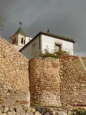 By the 14th-15th centuries, regional instability led to the increased need for defences, and the church was fortified. Records from the period indicate that the hilltop had been occupied by a fortified house with a strong curtain wall.[2] The earliest known remains of the castle date to the 14th century; a truncated circular tower to the south of the church is of this date. Also in the 14th century, the church was partially fortified, particularly the southern apse, and battlements were added.