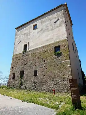 The construction of the tower dates back to the 11th century, but its existence is attested only from the beginning of the 16th century,[3] when the documents mention it as a "castle". The transformation in its present form dates back to this period, when the original height was probably reduced and buttresses were added. The first floor of the interior is supported by cross vaults. Near the former entrance door, which opened on the first floor, fragments of medieval decoration are walled up.