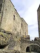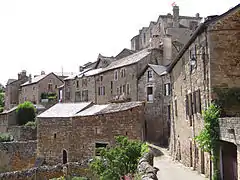 A castle was built on this strategic rock in the 8th century. It was rebuilt in the 11th century. The south wall of the keep was the strongest with the principal vaulted rooms and two square corner towers. A grand staircase was placed to the north in the 18th century. A 15th century entrance gate displays the coat-of-arms of the two families. Also at this time two wings were added conserving the appearance of a fortress. The core of the village was protected by defensive walls which are mainly intact. 44.12961°N 2.93252°E[5]