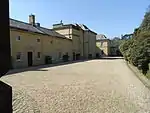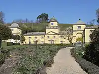 A circular library was added in the early 19th century. In 1841 the architect Edward Blore (1787–1879) added a porte-cochere on the north side of the main range, now demolished and replaced in 1974 by an entrance porch to the design of Raymond Erith. Blore also refashioned the entrance hall and stairs and added a top storey with mansard roof. In 1861 Blore added at the east side of the house service wings and stables, thus considerably elongating the southern appearance of the building beyond the east wing. The service wing is set back from the east wing by the width of the entry road which passes directly in front of it, and is topped in its centre by a clock tower. Adjoining it on its east end and extending backwards to give the ensemble an L-shape, is Blore's stable block. This has small circular windows with portrait busts, and is pierced on its long eastern face by the imposing full height main entrance arch, through which vehicles pass and continue past the front of the service wing and through decorative inner gates into the courtyard situated between the north facade of the main range and the steep and rocky hillside.