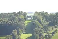The house is surrounded by landscaped grounds containing many picturesque structures and decorative points-de-vue. The former include three small classical-style Greek temples, the Sunrise Temple (1831), the Sunset Temple (1831) and Satyr's Temple (1861); the Traveller's Cross, erected in 1831, but formerly situated on a roadside near North Aller; Ugley Bridge (1861), an imitation of an old Devon packhorse bridge; The Sybils' Cave (1861), filled in while the house served as a home for evacuated children during World War II, but since re-opened. The ancient parish church formerly situated next to the former pre-Palladian manor house was demolished in 1732 by Lord Clinton with the licence of Stephen Weston, Bishop of Exeter, and was rebuilt to a new design in its present position some 1 mi (1.6 km) to the west of the house, visible from the terrace. This made available an unencumbered site for the planned landscaping. Other points-de-vue include the Sham Castle, the Triumphal Arch, the Ebrington Tower and the Sham Village (now demolished).