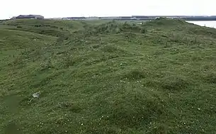Originally situated on "a rock near the sea",[6][7] Castlehill is today about 1 mile inland as shifting sands have significantly altered the shape of the coast. Located to the south of Loch Strathbeg it can be seen as a grassy "circular mound"[8] which is "oval & natural with its top slightly dished".[5] A 1791 book states it has a "summit"... [of] "half a Scots acre"[9] (approx. 0.25 hectare) and "rises 38 feet"... (11.6 metres) "above a small plain on the"... north-east "but is only 12 or 14 feet"... (3.7 or 4.3 metres) "above the higher ground"[10] to the south-west.