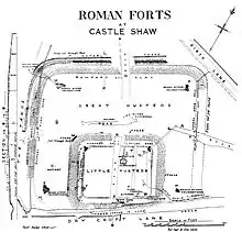 After being abandoned by the Romans, Castleshaw was rediscovered by antiquarian Thomas Percival in 1752. The remains were in good enough condition for him to draw a plan and he commented that he was "pleased to find a double Roman camp". He also remarked that the Roman road from Manchester running east to the Pennines was "the finest remain of a Roman road in England that I ever saw".[4] The site has suffered damage from ploughing in the 18th and 19th centuries as it is situated in one of the best draining areas of the valley.[4] In 1897, a local antiquarian and poet, Ammon Wrigley, dug several trenches on the site. He did not record the results of his digging and unrecorded digs continued on and off until 1907.[17] In 1907, the site was bought for the purpose of organised excavation and survey which continued from 1907 to 1908 under the supervision of Francis Bruton who had recently been involved with the excavation of Mamucium.[18] The spoil heaps from the 1907–08 dig were never levelled, leaving a series of misleading modern earthworks on the interior of the site.[19]