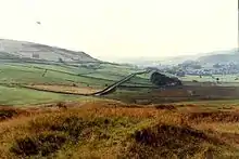 The fort and fortlet at Castleshaw are situated on a step of Grindslow shale on the eastern side of Castleshaw Valley below Standedge, part of the Pennine ridge in northern England.[4] From the site there are clear views up and down the valley, although it is overshadowed by higher ground on all sides. It is remote and exposed and lies along the Deva Victrix (Chester) to Eboracum (York) Roman road. The road crosses the Pennines at Standedge where the area dips and narrows, creating a traversable pass which would have been guarded by the Castleshaw fort.[4] The nearest forts are Mamucium (Manchester) 16 miles (26 km) to the west and one at Slack 8 miles (13 km) to the east, both on the line of the Roman road.[5] There was also a small Roman military installation, possibly a fortlet or signal station at Worlow, between Slack and Castleshaw.[5][6] The later fortlet is on the same site as the fort (grid reference SD99880965).[4]