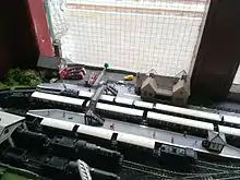 In the spring of 2014 an "N" gauge model railway layout was installed in the bay window of the stationmaster's office facing out onto the station's platform area, as an additional attraction to the site. The diminutive layout was based around the Great Western Railway and usually operated only in season when trains were calling at the station and at peak times. It was installed by the seasonal stationmaster as a project of the "Friends of..." group to complement the historical displays around the site and consisted of two independently operating loops with a variety of sidings, including a locomotive shed and yard, and goods yard with coaling area and was constructed to fit the small bay window of the stationmasters' office, viewable from outside by members of the public. The layout featured one station with island platforms and footbridge, a fire station complete with pumps and tower, a large spired church with graveyard, detailed allotments, a piggery, and a windmill which dominated the small area. The layout operated model locomotives of the Castle Class, Pendennis Castle and Drywyllin Castle which operated regularly, the similar Hall Class Albert Hall and Kinlet Hall, and a prototype Flying Banana railcar, as well as a number of early Pannier Tank engines, a Prairie Class, and an autocoach with 14XX tank engine all in Great Western livery. In addition a large range of bogie passenger stock operated and a rake of diminutive four-wheelers, all carrying the traditional chocolate and cream colour scheme of the pre-war Great Western Railway by and large. Private operator wagons and vans also featured on the layout, which had an integral goods yard. The layout was removed from the station in February 2016.