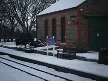 On the rear goods siding, one of the railway's three breakdown cranes was stored for a number of years, being removed in 1991 and subsequently restored and placed on display at Union Mills on the site of the former railway station. This crane was constructed in 1893 by the Birmingham-based firm Richard C. Gibbins. Inside the station's waiting room are several framed displays charting various historical aspects of the railway featuring old photographs, framed tickets, maps and other historical documentation relating to the earliest days of the railway. A headboard commemorating the centenary of the adjacent Poulsom Park in 1996 is also mounted on the wall above the fireplace, several other pieces of ephemera are available to view at the station. For many years, there also featured large advertisement hoardings lining the down platform but these were removed in 1974 having become unsafe. An original signal windlass constructed by the Birmingham company A.J. Linley & Co., was also displayed on the up platform for many years, a similar version is extant and used to operate the unique slotted post semaphore signal which protects the station's southerly side.