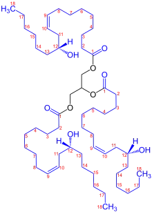 Castor oil is a vegetable oil pressed from castor beans.[1] It is a colourless or pale yellow liquid with a distinct taste and odor. Its boiling point is 313 °C (595 °F) and its density is 0.961 g/cm3.[2] It includes a mixture of triglycerides in which about 90% of fatty acids are ricinoleates. Oleic acid and linoleic acid are the other significant components.
