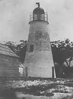 The first lighthouse at this location was erected in 1831, following an appropriation in 1827.[1] Construction was delayed by the need to survey and acquire land. The contract was given to Winslow Lewis, who also constructed the Pass Christian Light under the same contract.[3] Lewis subcontracted construction of the Cat Island tower to Lazarus Baukens, who erected a conical brick tower to the same design as that used for the Pass Christian Light.[1] An 1854 inspection, however, revealed that the structure was set directly on the sand, with no foundation whatsoever.[3] It was provided with the lamp and reflector arrangement typical of such early lights. This was replaced in 1857 with a Fresnel lens, and in 1859 a new lantern was constructed.[3]