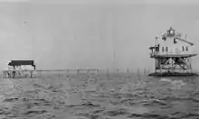 The previous year, a new lighthouse was erected, a square screw-pile structure.[1] Erosion and storms continued to be problems, and in 1900 riprap was piled around the piles to stabilize it.[3] In 1937 the light was discontinued due to decreasing traffic through the area.[3] The house stood abandoned and eventually burned in 1961.[3] The iron foundation continues to stand and appears as a hazard on NOAA charts.[5] It is also a local fishing spot, known affectionately as The Bird Cage.